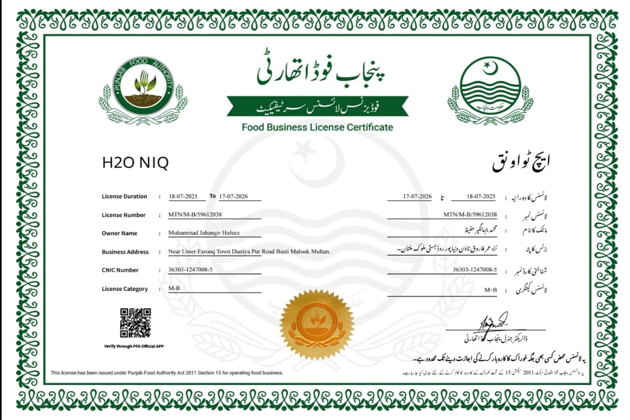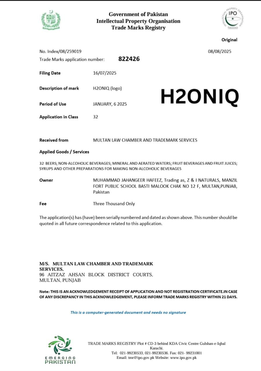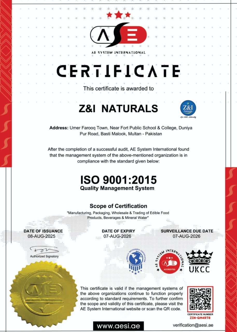 At Z & I Naturals, quality is at the heart of everything we do. Our certifications guarantee that both our company and our flagship brand H₂ONIQ meet the highest international standards of purity, hygiene, and safety. From source to sip, every step is backed by trust you can rely on